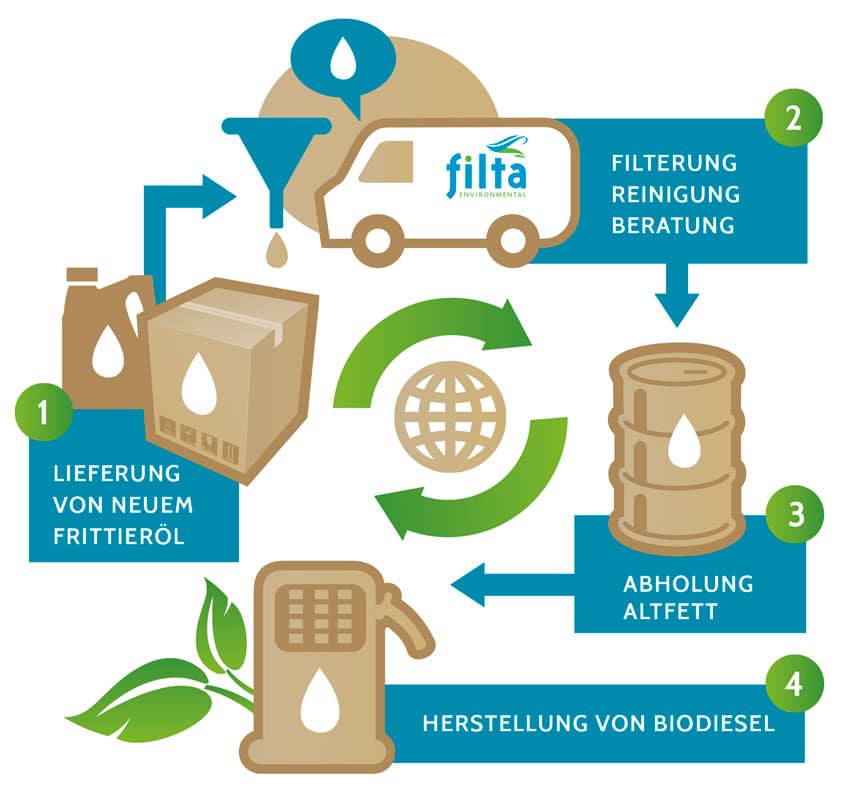 kulturell - gerne beraten wir Gastronomen in Sachen Frittieröl. Viele Filta-Kunden verzichten bereits auf das umweltschädliche, billigere Palmöl zugunsten langlebiger Qualitätsöle. Wir zeigen auch, dass Öl nicht immer sofort entsorgt werden muss, sondern mehrmals gefiltert werden kann.